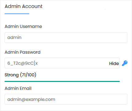 • Admin Username: Your new b2evolution username (for security reasons, do not use the administrator or the admin username).