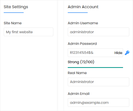 • Admin Username: Your new e107 username (for security reasons, do not use the administrator or the admin username).